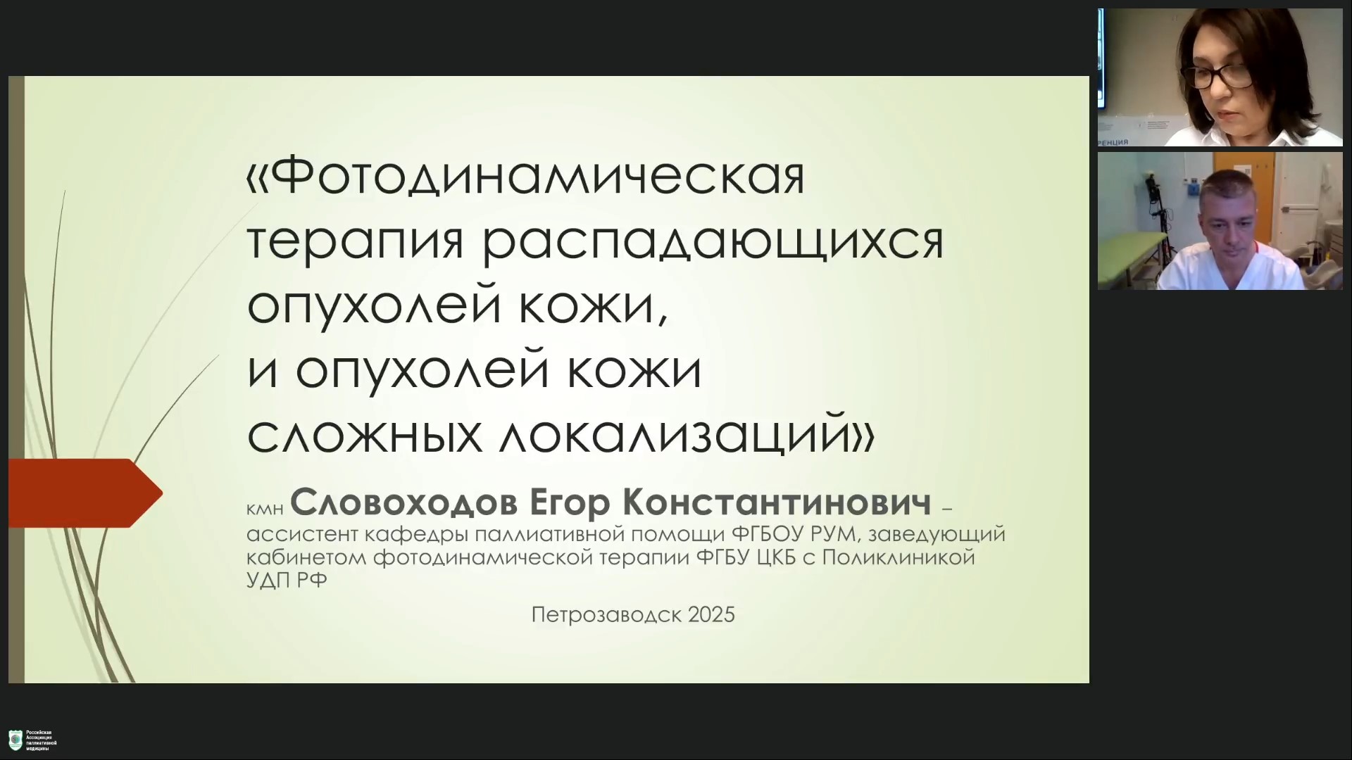 Фотодинамическая терапия распадающихся опухолей кожи и опухолей кожи сложных локализаций - Словоходов Егор Константинович, к.м.н. Центр онкологии ФГБУ ЦКБ с поликлиникой УДП РФ г. Москва. (онлайн) Модератор в зале Новиков Георгий Андреевич.