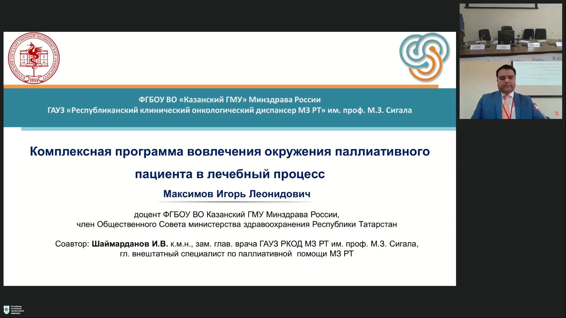 Комплексная программа вовлечения окружения паллиативного пациента в лечебный процесс – Максимов Игорь Леонидович, к.м.н., доцент кафедры биомедэтики, мед. Права и истории медицины Казанского ГМУ. Содокладчики: Шаймарданов Ильсур Василович, к.м.н., зам. главного врача Клинического онкологического диспансера Минздрава Республики Татарстан, главный внештатный специалист по паллиативной помощи МЗ РТ, г. Казань