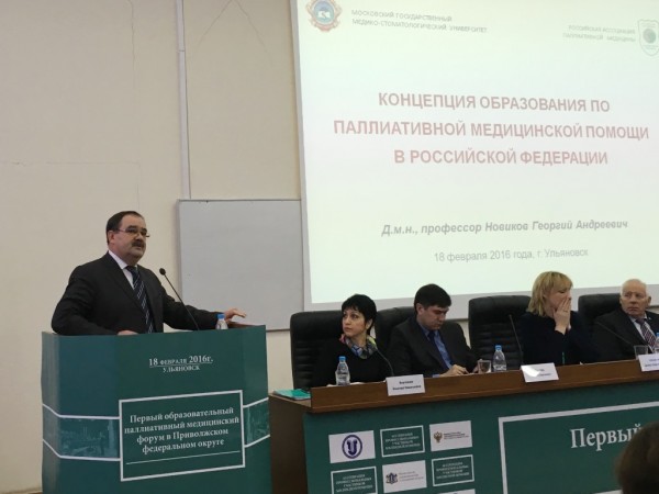 В заседании с докладом «Концепция образования по паллиативной медицинской помощи в Российской Федерации» выступил Новиков Георгий Андреевич, д.м.н., профессор, заведующий кафедрой паллиативной медицины факультета дополнительного профессионального образования Московского государственного медико-стоматологического университета им. А.И.Евдокимова, председатель Правления Российской Ассоциации паллиативной медицины.
